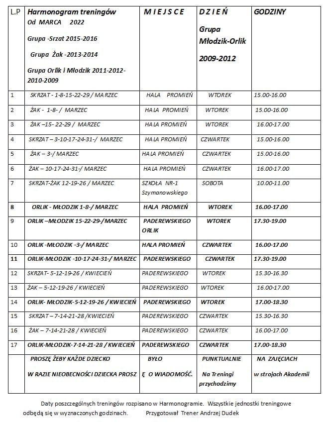 16 lutego, 2022Zamieszczamy pełny harmonogram treningów Akademii na miesiąc marzec i kwiecień. Serdecznie zapraszamy nowych adeptów.